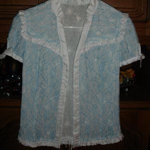 In excellent condition, only worn a handful of times. Has a nice detail on the sleeves and on the back. Is a white cotton fabric with light blue lace over top.