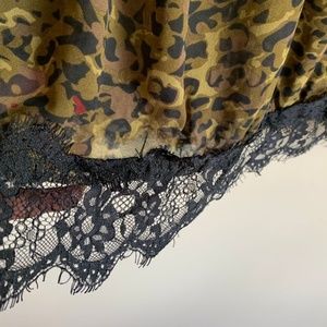 So pretty! Unique camo style print by with cute black lace detail bottom, sleeves and soft gathered neckline.