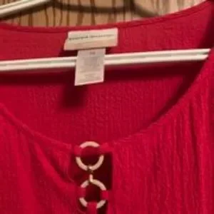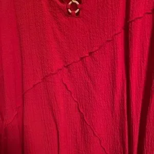 Lovely color, nice crinkle type weight, detail stitching with cute side tie at bottom. 3/4 comfort sleeve with slit cuff for added comfort on arms. Brass trim at neck adds nice touch at neckline.