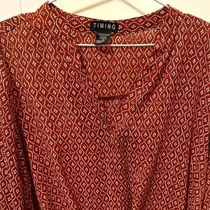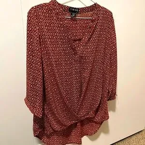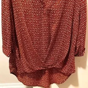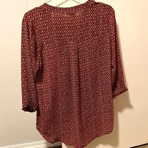Light and dressy/casual blouse. Looks great with skinny jeans! Deep red/burgundy and cream colour. No damage. Cuffed 3/4 length sleeves. Pleated back. Tummy ruched and longer in the rear. Cute top! Fits like a small.