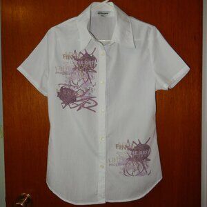 White with purple design. Easy washing/drying. Slight ironing.