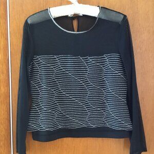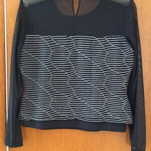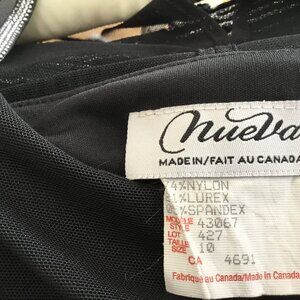 Black sheer. Bright silver. Long sleeves. Nylon, spandex.