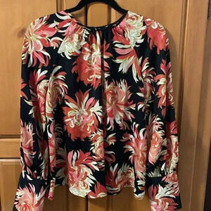 Gorgeous! Black with pink, red, white floral pattern. Long sleeves with cuffs - 7 buttons. Light and flowy. Size Medium.