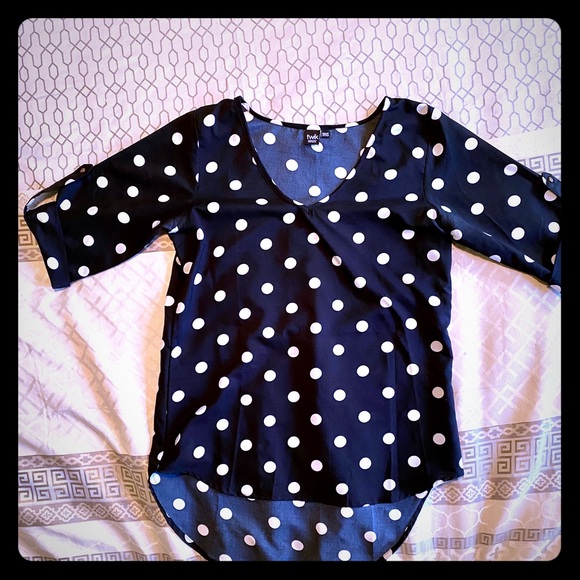 A cute blouse bought from Simons. The fabric is soft. No zip or buttons. Black with white dots. Worn a few times, still looks like new. Help me clear my closet! All reasonable offers will be accept!
