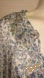 Lightweight white sleeveless blue-floral-print top with ruffles, gold tinsel-looking accents and a drawstring collar
