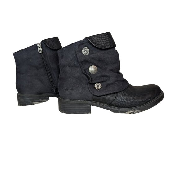 Comfortable and casual Blowfish Kay-Kay vegan ankle booties in like-new condition. Features a side zipper for easy on/off, stylish ruching, and three branded button details for added texture and interest.