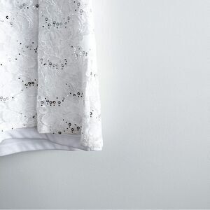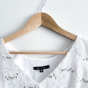 Blu Sage Tank Top V Neck White Women's M. Lace, Silver Sequins, Lined. Bit of stretch. Would look stunning with a black skirt to wear to a Christmas Party. Or wear dress pants and a blazer or cardigan over top for a bit of sparkle. Very good used condition. Please see photos for approximate measurements.