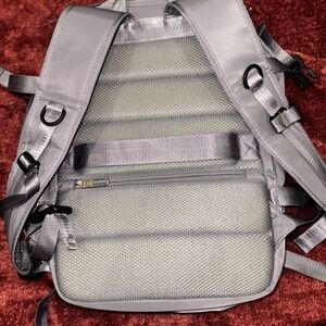 Has two additional pockets on the outside. One on the back. 2 main pockets. A large compartment with straps.