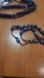 dark-colored (possibly black or very dark blue) beads, a light-colored cord connecting them, and a black crucifix at the end. The crucifix depicts Jesus Christ on the cross, and the letters "INRI" are visible at the top of the cross.