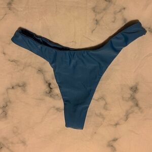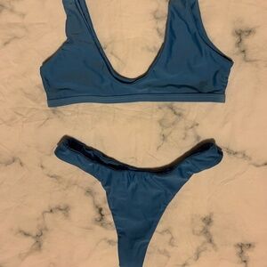 Brand new, never worn. Blue bikini with thong cut bottoms and a scoop neck top. Both in size small.