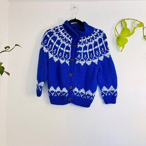 Cozy up your wardrobe with this beautiful handmade knit sweater in a vibrant royal blue with intricate white detailing. Featuring a button-down front with wooden buttons and a classic collar, this piece is one-of-a-kind and perfect for cooler seasons.