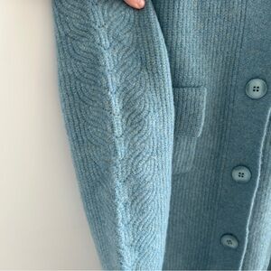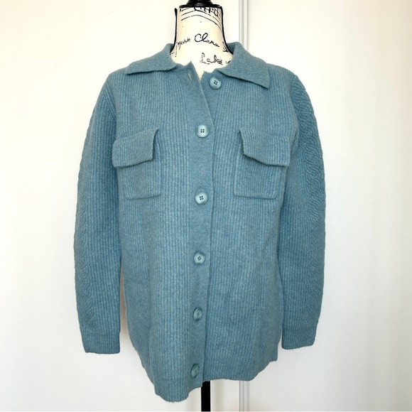 Blue knitted cardigan with button-up front and collar, featuring a relaxed fit and a streetwear vibe #loungewear