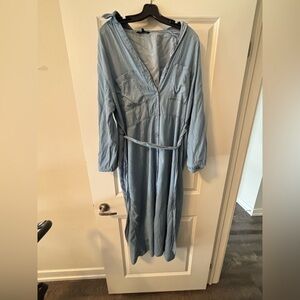 Stylish blue button-up dress with a belt. Perfect for casual outings.