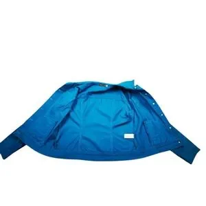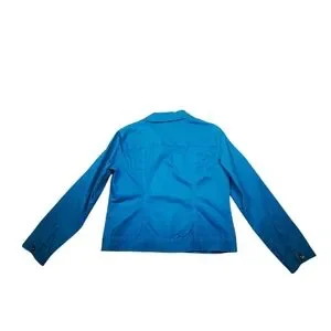 Stylish blue button-up jacket with a classic collar and front pockets. Perfect for casual outings.