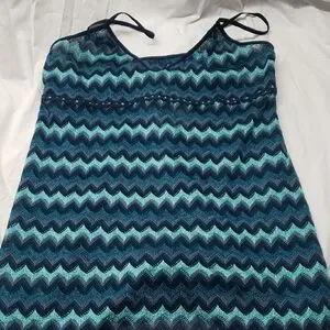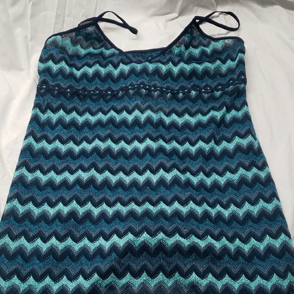 Stylish swim cover up dress with a blue chevron pattern. Features a sleeveless design with peakaboo back panel