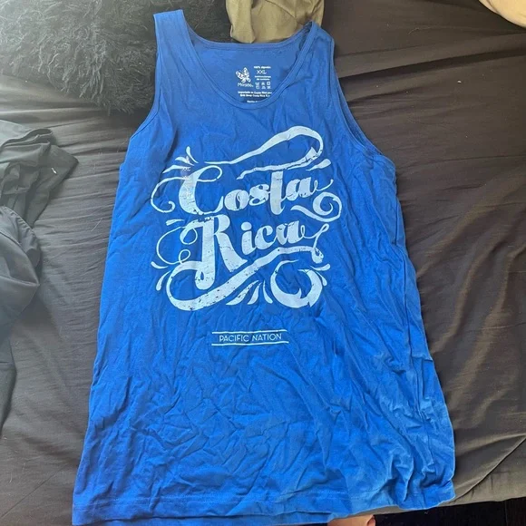 Vibrant blue tank top with 'Costa Rica' graphic. Perfect for casual wear.
