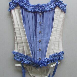 Blue and creamy off-white satin seriously steel boned corset with ruffled tops and bottoms