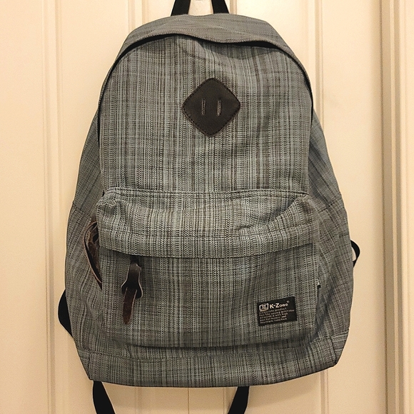 Blue/Grey crosshatch Backpack with brown features. Approximately 18L.
