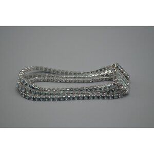 A sterling silver tennis bracelet made of three layered strands with light blue cubic zirconia stones, stamped ADI CZ 925. It weighs 29.81g and measures 8" in length. In excellent condition, please review photos closely.