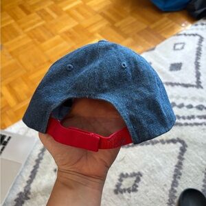Stylish blue denim cap featuring Betty Boop and red heart accents. Perfect for casual wear.