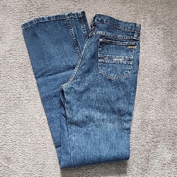 Classic blue denim jeans with a stylish design. Features a back pocket detail. 30" waist 38" length
