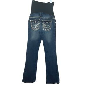 Cool pair of distressed jeans, stretchy, heavy embroidery stitch.