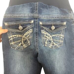 Cool pair of distressed jeans, stretchy, heavy embroidery stitch.