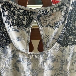 This stylish tank top features a chic cut-out design and subtle beaded embellishments, perfect for adding a touch of elegance to any outfit. The blue color complements the flowy fabric, making it a versatile piece for various occasions. Pit to pit 18” Length 13.5”