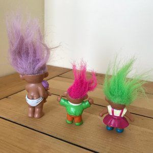 Set of 3 vintage plastic troll figurines: two are SOMA 2" figures, one in a pink dress with green hair (A7) and the other in a green jacket with pink hair (A4). The blue-eyed troll with lilac hair is dated '92 on the back, has a white discoloration to right eye, 2 1/2" tall. All are in vintage "played with" condition: figures have rub marks/scrapes to paint, discolorations, messy hair.