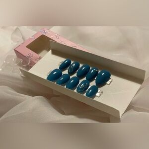 Blue Fire Almond Nail Tips Press on Nails. Embellished with gems and silver metallic.Long lasting gel polish.
