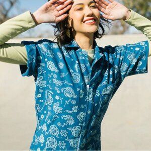 This Blue Floral Jumpsuit was inspired by Asian batik, particularly the patterns found in southern China. There are adorable flowers (some with faces!) and butterflies intricately printed all over this jumpsuit, in a very light teal, on a beautiful deep royal blue. Sustainably made in Jaipur India with 100% cotton twill, printed with Azo-free ink. These jumpsuits are slightly oversize, please see sizing chart in photos and email with any questions.