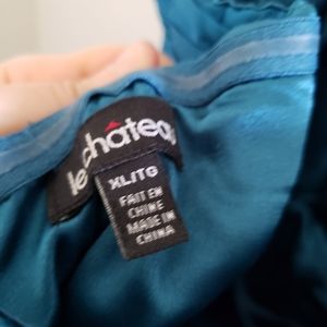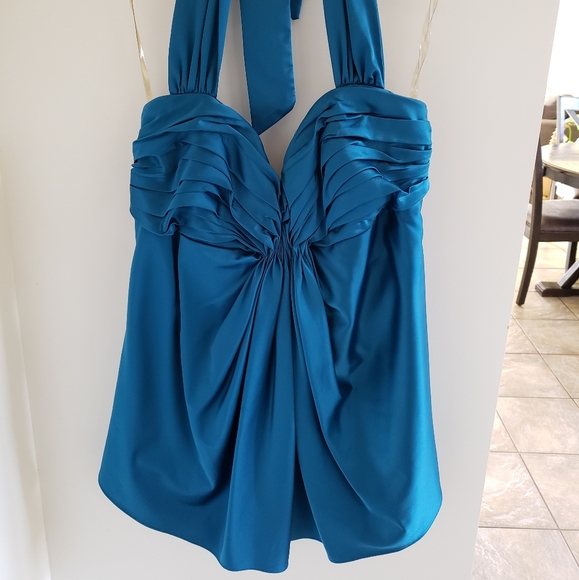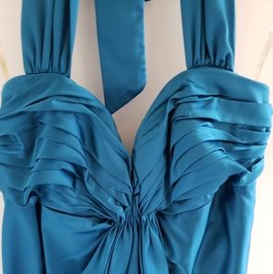 Blue halter style blouse for a formal occasion. Beautiful detailed neckline. Fabric flows away from body. No need to wear a bra. Size XL