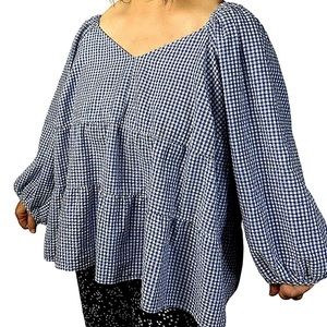 Blue Gingham Babydoll V-neck Tiered Women's Top