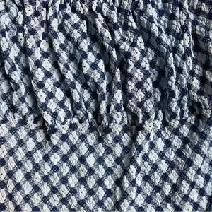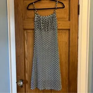 cute slim-fitting blue and white midi dress! textured gingham-esque print, looks more like small dots close up. double lined with a beautiful light blue satiny material. straps are not adjustable. would best fit an XS-S.