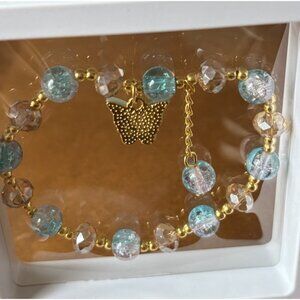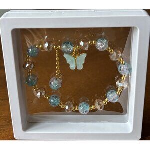 Blue & Gold Beaded Stretch Bracelet Butterfly Charm in 3D Floating Display Case