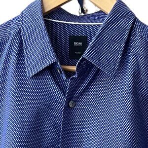 Blue Hugo Boss Men's Geometric-Print Cotton Shirt. 100% Cotton. Very good condition. Size: Large.