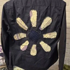 Re-worked Navy Blue heavy button down with patchwork floral design on back!
