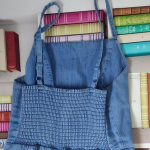 This blue jean jumpsuit is soft, stretchy, and comfortable. It is perfect for all seasons: to just wear as is in the summer or to layer in the winter. It has adjustable straps and a stretchy bodice so it'll fir any body type. Stain spots on pant leg that are not very noticeable when wearing but can fade/come out with the right effort. There is also a stain on the chest part of the jumpsuit that is hard to notice