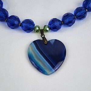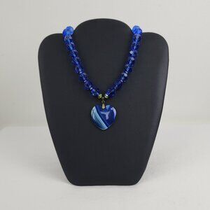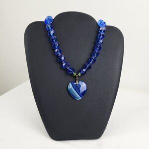 Blue Lace Agate Heart Shape Stone Pendant Faceted Crystal Bead Necklace Handmade