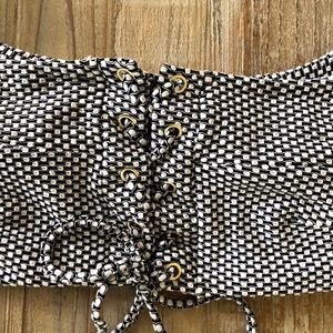 This bikini top by Blue Life features an off the shoulder neckline, lace up detailing on the bust, and seersucker print.