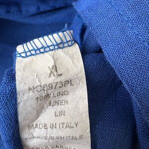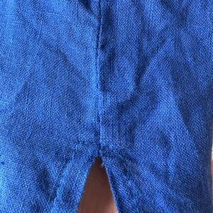 Gorgeous linen top/lightweight blazer in a stunning Colbalt Blue. 2 front patch pockets. Nice big shell buttons. 2 small slits along both sides. Both shown-one was hand mended by me-highlighted in photos and reflected in price. In great preloved condition.