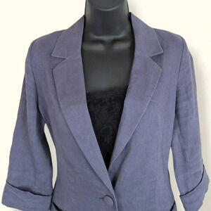 This contemporary jacket/blazer by Denim Co is a dusty blue and is made of 100% linen. It has rolled 3/4 length sleeves, a single (covered) button front closure, 2 front pockets, and a slit in the back for movement. This jacket is lightweight, comfortable, and can easily jump between casual and professional.