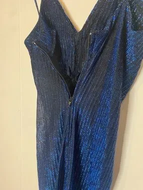A striking blue metallic slip dress with a ruched front and delicate spaghetti straps. Soft V-neckline and fitted bodice create a flattering silhouette. Shimmering fabric and front slit add elegant, evening-ready appeal. Perfect for special occasions and nights out.
