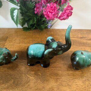Blue Mountain Pottery Elephant Figurines Green Drip Glaze Canadian Pottery Set