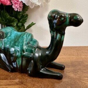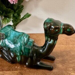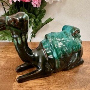 This charming lying camel figurine from Blue Mountain Pottery showcases the signature drip glaze in deep emerald green and black, forming a beautiful marbled effect. A wonderful example of mid-century Canadian ceramic artistry, this piece captures the gentle form of a resting camel, complete with carved folds and saddle-like details.