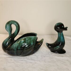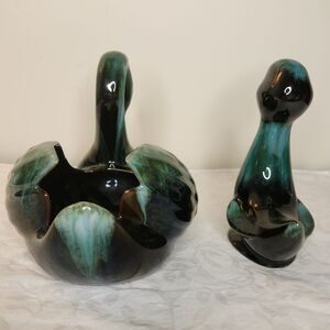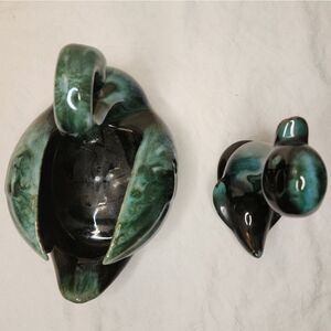 Classic Black & Turquoise Blue Ombre Drip Glazed Pottery Set of baby Duckling (cygnet) & beautiful mama Swan, by BMP, Blue Mountain Pottery.