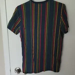 good condition Dark blue shirt with yellow, green, and red stripes.