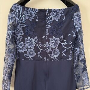 This sophisticated blue dress is designed with an off-the-shoulder neckline and long sleeves, perfect for a wedding guest or cocktail event. The sheath silhouette offers a flattering fit, while the elegant lace detailing adds a touch of refinement. Ideal for making a stylish statement at any formal occasion. also, there’s about 7,5” slit on one side shown on the last picture