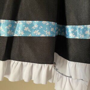Full skirt with white ruffle hem and blue floral ribbon trim