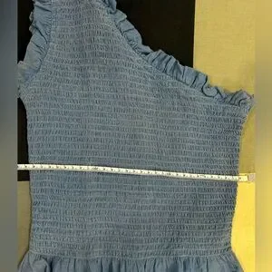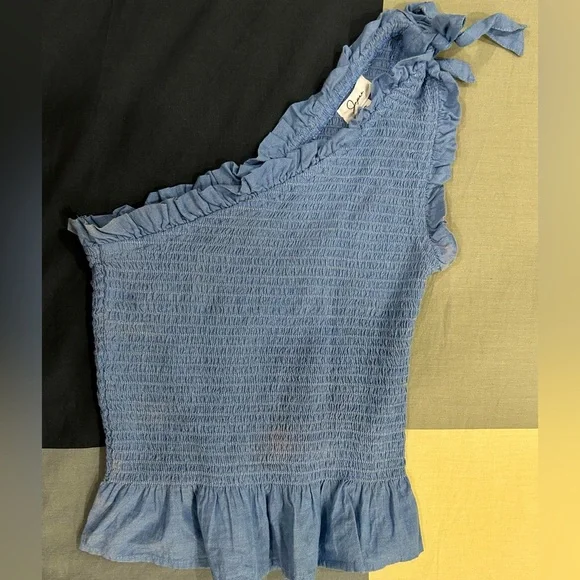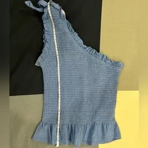 This cute blue blouse features a one-shoulder design with an asymmetrical cut, adding a modern twist to your wardrobe. Comfortable fit. Perfect for both casual outings and more formal occasions.